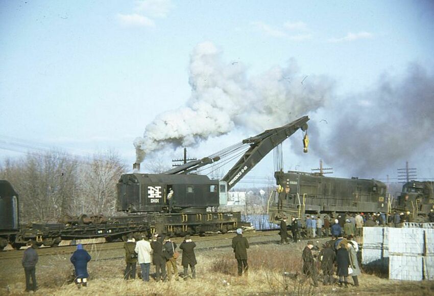 Here’s a heavier crane, NH #D101 rescuing a derailed Penn Central unit. The mishap was on the old New York Central/B&A in Natick, MA. Seems the number of supervisors is pretty large!
