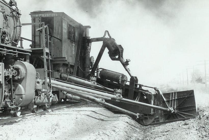 We’ve shown pics of Jordan spreaders before – Here’s a pic of one in front of a steamer. Jordan spreaders can be used for spreading ballast, clearing ditches, or for snow removal – great piece of equipment for around the MOW track.