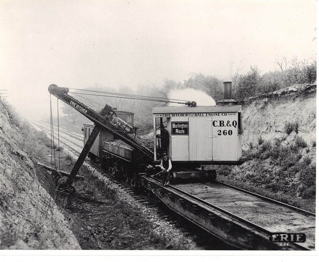 CB&Q #260 is an Erie Type B steam powered ditcher shown demonstrating its use. The pic was taken by Erie in 1923 as a promotional photo.