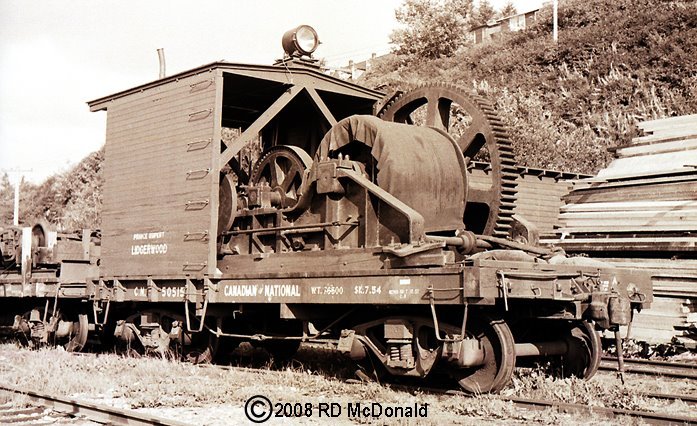 Another Canadian National pic – CN #0515 is a Lidgerwood (winch), built by Lidgerwood Manufacturing Co., New York City. Pic is taken in Prince Rupert, BC August 28, 1958. These powerful winches were used by railways and contractors to build and maintain tracks. They were powered by steam from the locomotive and were quite powerful dragging a plow through several gondola loads of ballast. They were always simply called a “Lidgerwood” since the manufacturer’s name was painted on the side and it was an easier way to identify it.