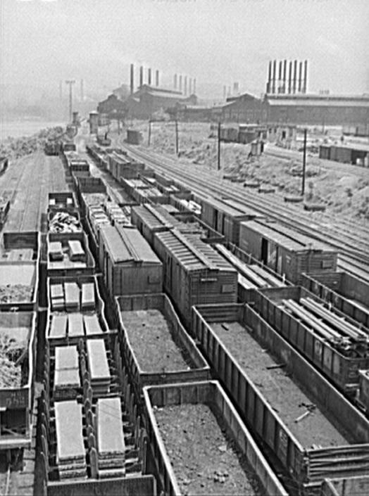 Pittsburg – city of coal and steel: This is a 1940’s pic of a yard near the steel plants in Pittsburg. Checking out the loads in the gondolas, there looks to be several gons with heavy strips – can’t tell if they’re steel or some other material. The car closest to the camera appears to be a flat with stakes holding the same strip load. Then there’s a row of gons with steel rod to the right, Quite a collection of loads further back, and some of the boxcars have open doors.