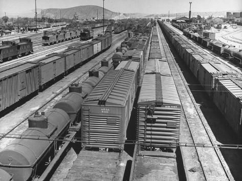 I decided to look at yards this week. These first few photos are similar in era (‘40s or early ‘50s) and similar in the general rolling stock “look”, but because they are taken from different cities, the make-up of the trains has a flavor of the traffic in that area. Then the later photos tend to fool me by a few years (?).