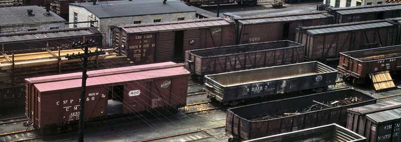 I got this photo from Pinterest originating with a blog discussing cars of the ‘40s & ‘50s. There’s quite a few outside braced boxcars that sets the time frame around or just after WWII. And the background and size of the yard immediately suggested Chicago to me. Further research showed that the photographer was Jack Delano who my source says took a lot of photos of the Proviso yard, outside Chicago, in 1942 and 1943. There’s lotsa boxcars, strips of reefers, and some long strips of hoppers and gondolas carrying coal.