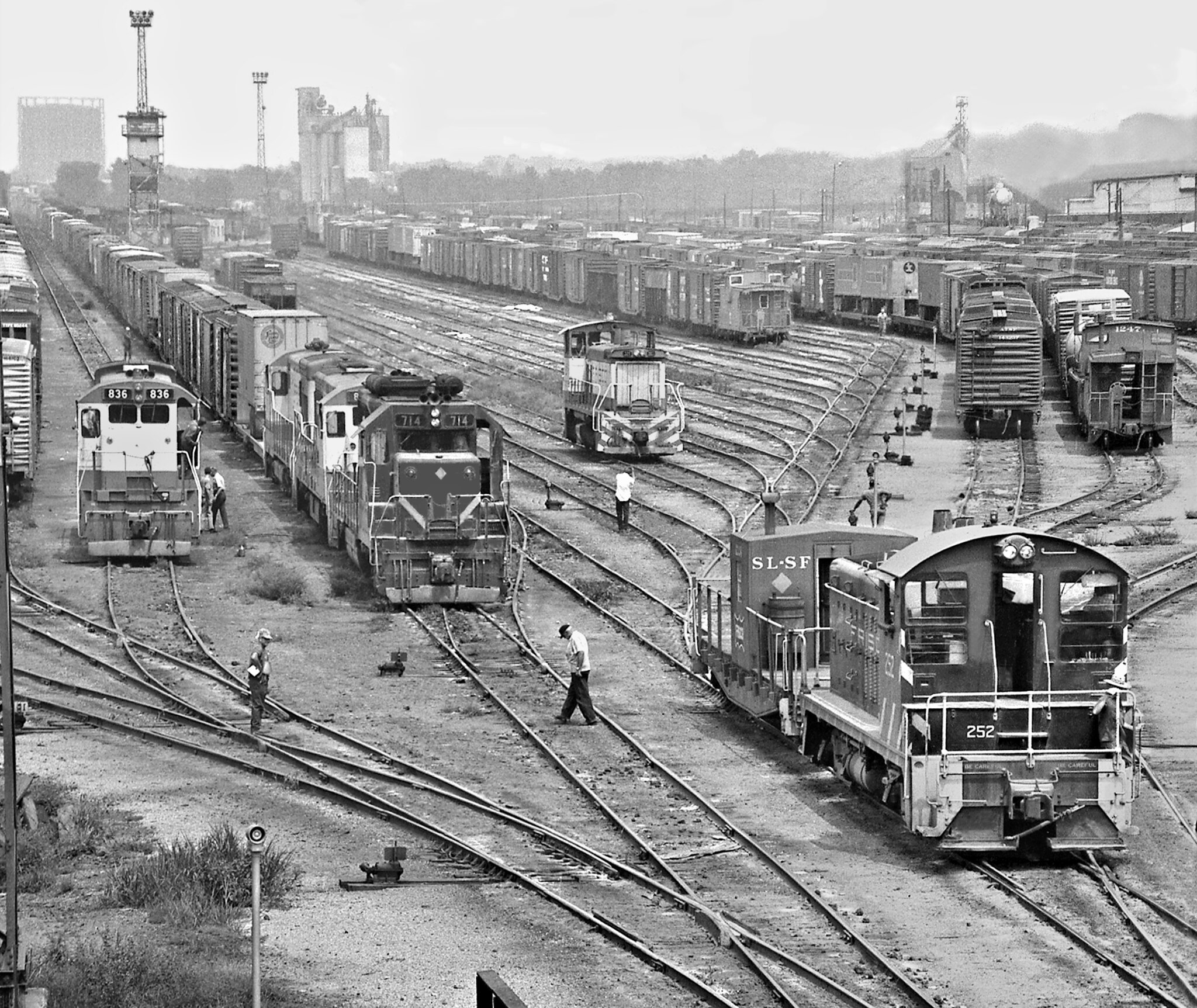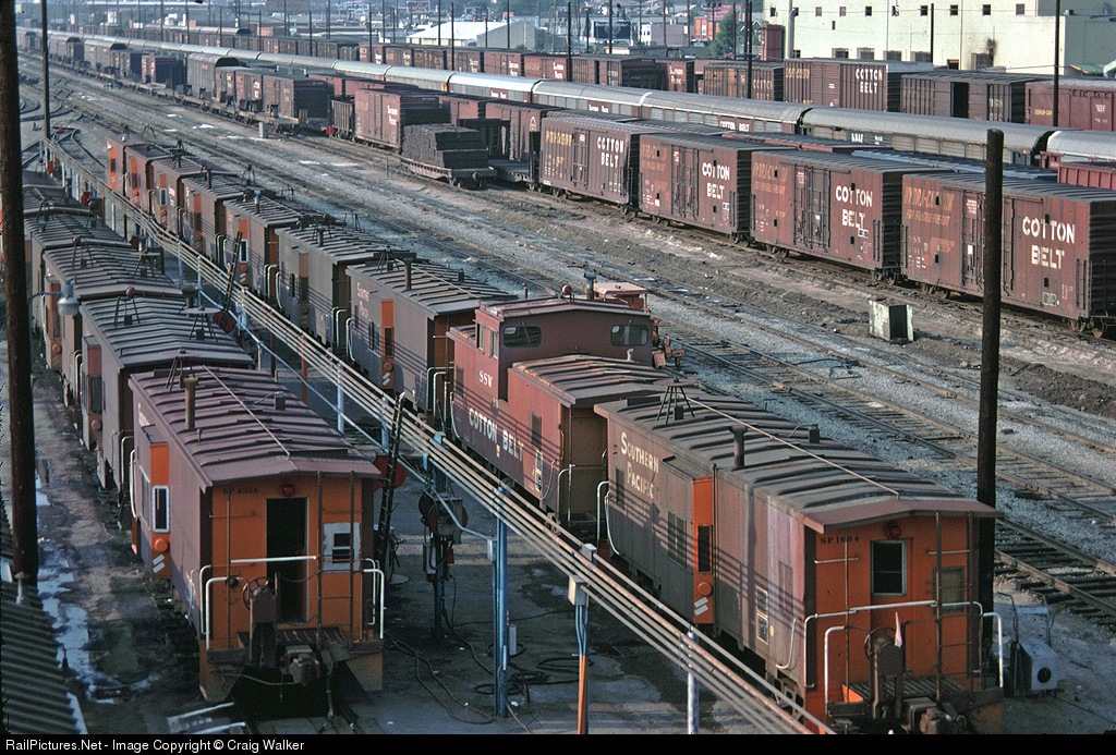 This pic is from the Southern Pacific yard in LA. The cabooses give away the railroad, although with all the Cotton Belt boxcars (St. Louis Southwestern Railway), I might have put the location in St. Louis or possibly somewhere in Texas. SP took over the Cotton Belt in the ‘30s. The abundance of 50’ plug door boxcars without roof walks pushes the scene into – my best guess – the ‘70s or later. There’s a ‘70s style auto-rack train towards the right. Yet the auto-racks don’t appear to be especially long – so I hesitate to go far into the ‘80s.