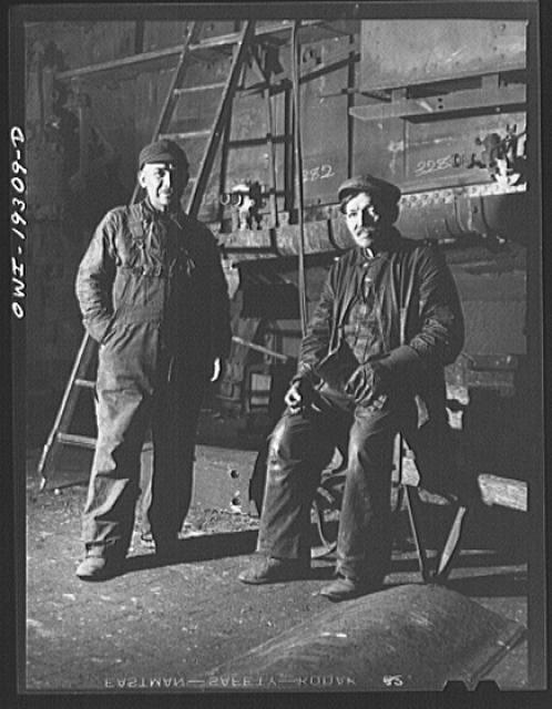 March 1943. Barstow, California. “Head brakeman J.C. Shannon (left) and swing brakeman B.E. Wilson waiting for their train to pull out of the Atchison, Topeka and Santa Fe yard.” Nitrate negative by Jack Delano.