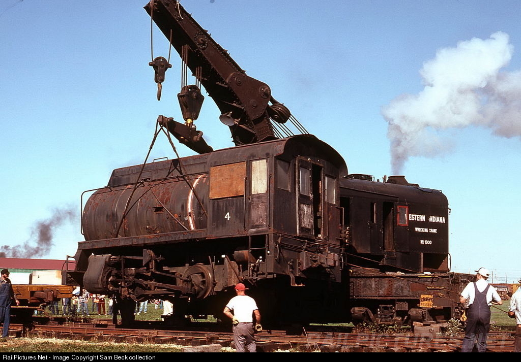 Illinois Railway Museum personnel are using their former C&WI crane to unload Union Electric Company #4, an 0-4-0F, onto museum property, 1982.