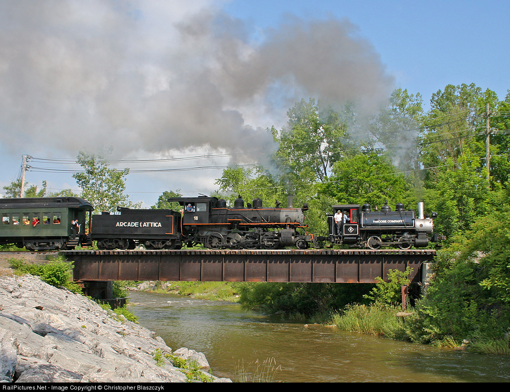We’ll finish up with this pic of a Doubleheader! American Viscose Company 0-4-0 #6, visiting from nearby Dunkirk, NY, teamed up with Arcade & Attica 2-8-0 #18 on a photographer’s special. The special has just passed through downtown Arcade and crosses the fast-moving Cattaraugus Creek on the way north to Curriers, 2009.