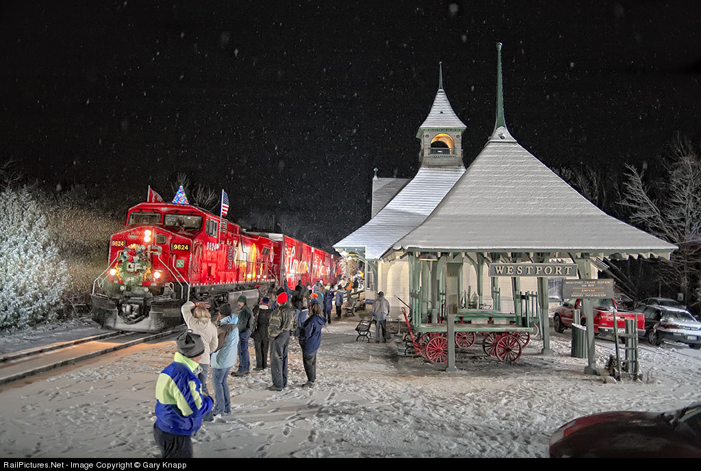 CP runs a Christmas train each year. I’m never sure if I’m getting this year’s pics, or previous years – but it doesn’t matter… CP Rails Holiday Train drifts past a crowd of admirers at picturesque Westport on the D&H. Falling snow completes this holiday scene.