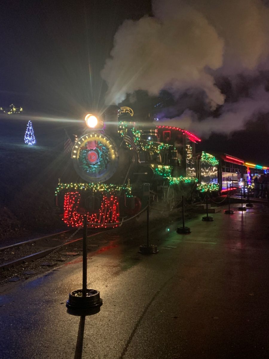 The Niles Canyon Railroad (CA) Christmas Train is a beautiful ride in antique trains that have been decorated lights & Christmas decorations.