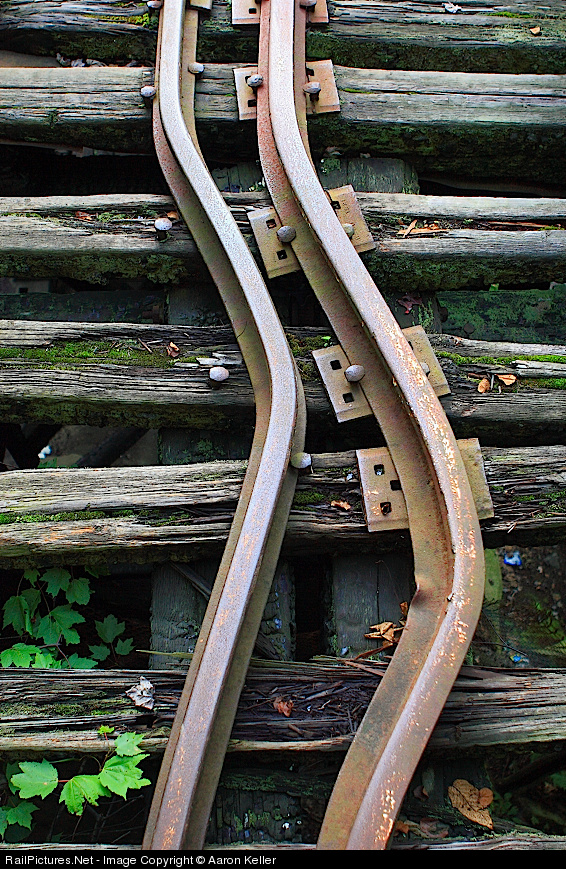 “This is what happens when rails are subjected to intense heat. The “sulphite bridge” in Franklin, New Hampshire, is a wooden covered bridge structure typical to New England. It was built in 1896. The last train crossed it in 1973. A fire inside the bridge on October 27, 1980, which is believed to have been arson, damaged the entire structure. The charred bridge trusses remain standing, however; and these bent rails tell the story of the intense heat that scorched the ancient timbers — which neither collapsed during the fire nor in the thirty years and counting since the fire occurred. The “sulphite bridge” got its name because this line primarily carried goods to and from nearby paper mills. Be sure to check photo no. 435049 (below) for another view of this bridge!”