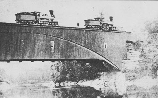 Here’s another example. (Combo Bridge, Newbury, NH – Haverhill, VT. Built 1852-53 Lost 1903. 1853 picture of “Pehaungun” and “Winnepesauke” of the Boston, Concord & Montreal Railroad.) Obviously, the bridge structure is different – an arch bridge, but the same tactic of sheathing the timbers under the track was used to protect the structure.