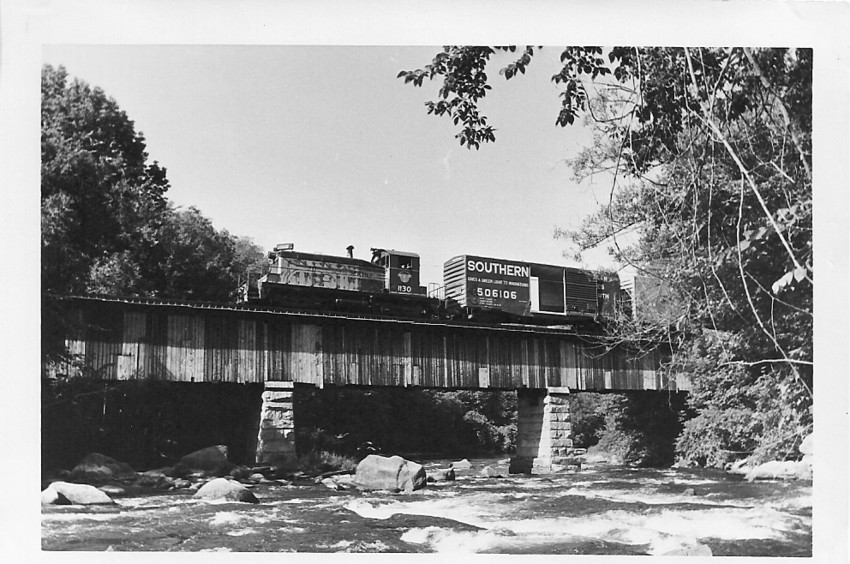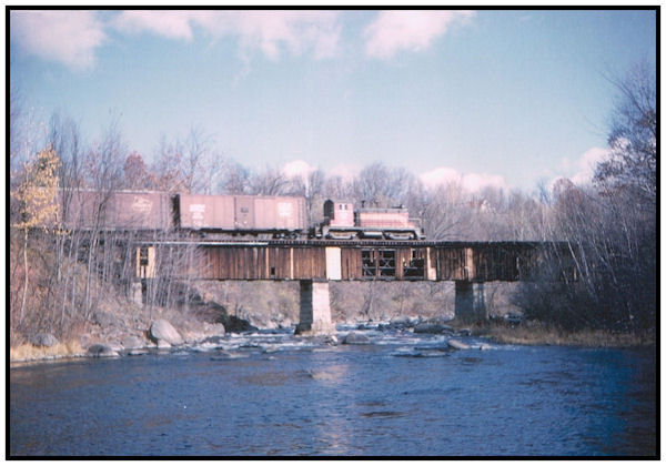 I scratchbuilt a model of a bridge similar to this around 1979. I saw an article in Railroad Model Craftsman with pics (could have been this bridge before it burned), and used the design for a covered bridge on my layout at my parent’s house – I was a freshman at UC at the time. What fascinated me was that the bridge is a covered bridge with the tracks on the top. The structure and sides would have been sheathed with vertical planks, just like a typical covered bridge, to protect the wood structure. But they ran the track on top rather than through to keep smoke and sparks from collecting and damaging the bridge. This was a relatively common practice in New England. You can just catch the cant of the “roof” on the side of the tracks. There would have been wood shingles on either side of the tracks on a canted roof structure which shed precipitation from collecting in the structure.